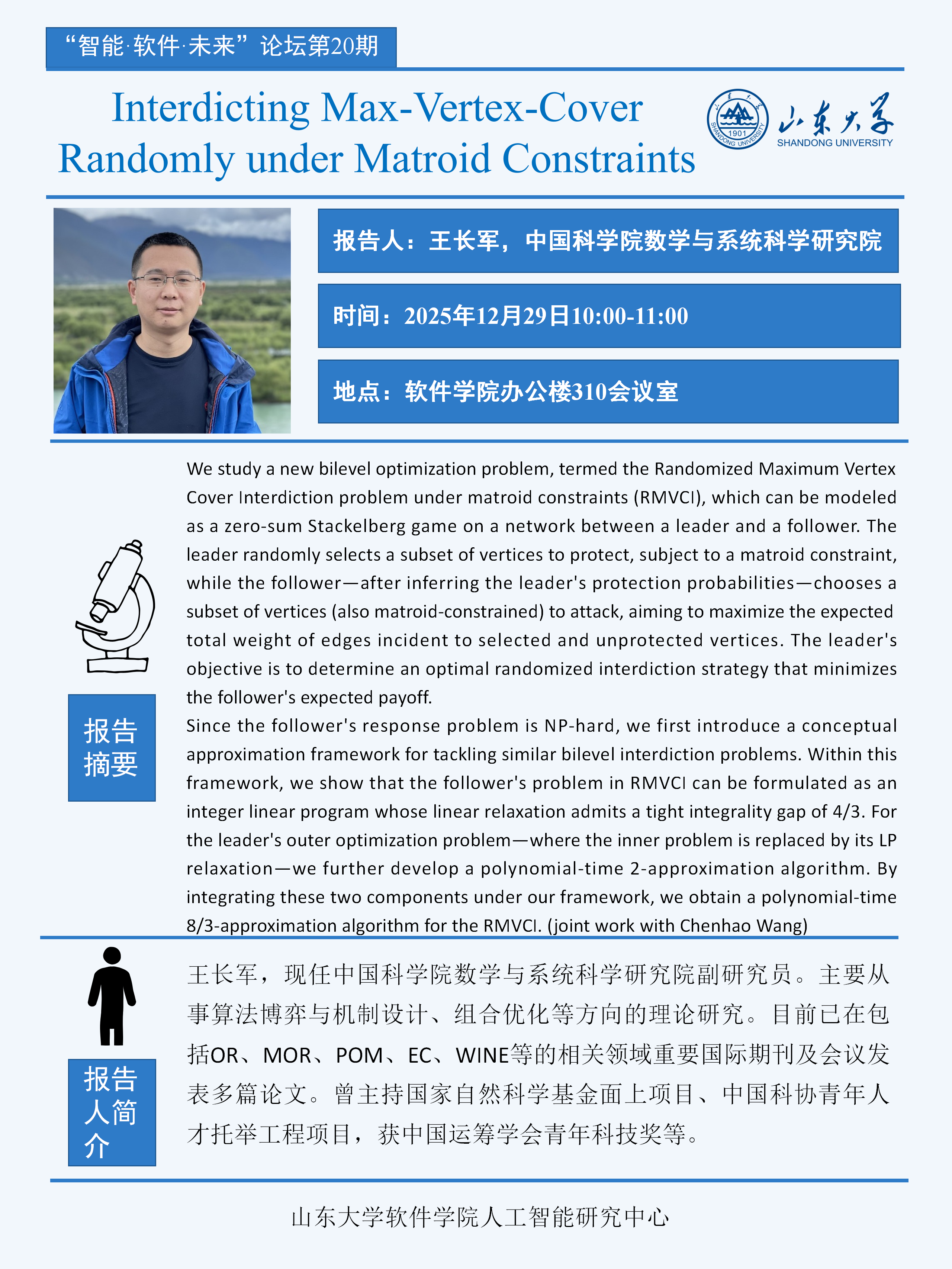 软件学院“智能・软件・未来”论坛第20期:Interdicting Max-Vertex-Cover Randomly under Matroid Constraints