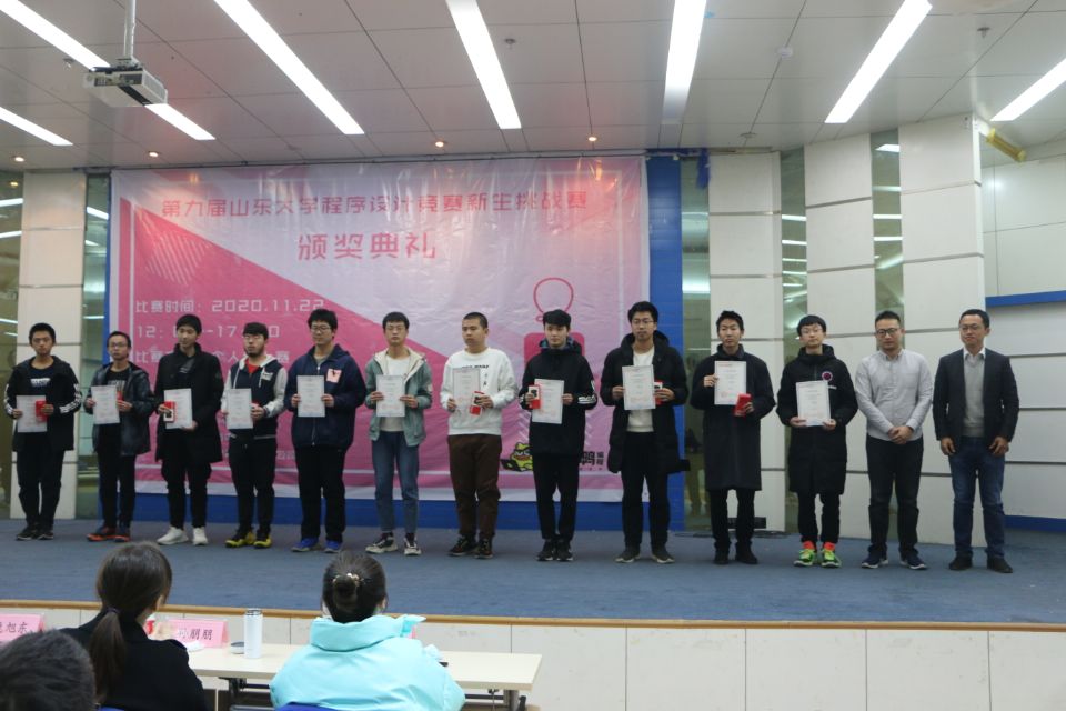 12月10日下午四时,第九届山东大学程序设计竞赛新生挑战赛颁奖典礼在软件学院办公楼二楼圆形报告厅举行,山东大学软件学院党委副书记吴天柱,山东可达鸭教育科技有限公司CEO许浩然,山东大学软件学院ACM教练鹿旭东,山东大学软件学院团委书记孙朋朋,山东大学软件学院2020级辅导员邵一丹作为嘉宾代表出席典礼,本次比赛一二三等奖获奖者以及优胜奖获奖者代表参与典礼, 山东大学软件学院何萌老师主持典礼。