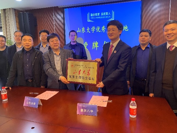 拓展组分别前往了重庆市第八中学、重庆市第一中学、重庆市南开中学和重庆市巴蜀中学四所重点中学,同各重点中学领导、年级组长、班主任老师举行了座谈会。另外,拓展组组长、山东大学软件学院党委书记仇道滨代表山东大学向重庆市第八中学授予“山东大学优秀生源输送基地”牌匾,并签署了合作协议书。
