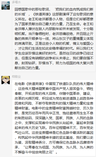 观影结束后,大家感悟到中华儿女为了反抗侵略者不畏牺牲,忍辱负重的坚韧,深深体会到我们党一路走来的苦难辉煌,今天的幸福生活是千千万万的英雄们用鲜血换来的。大家也微信群里纷纷发表了自己的感悟。