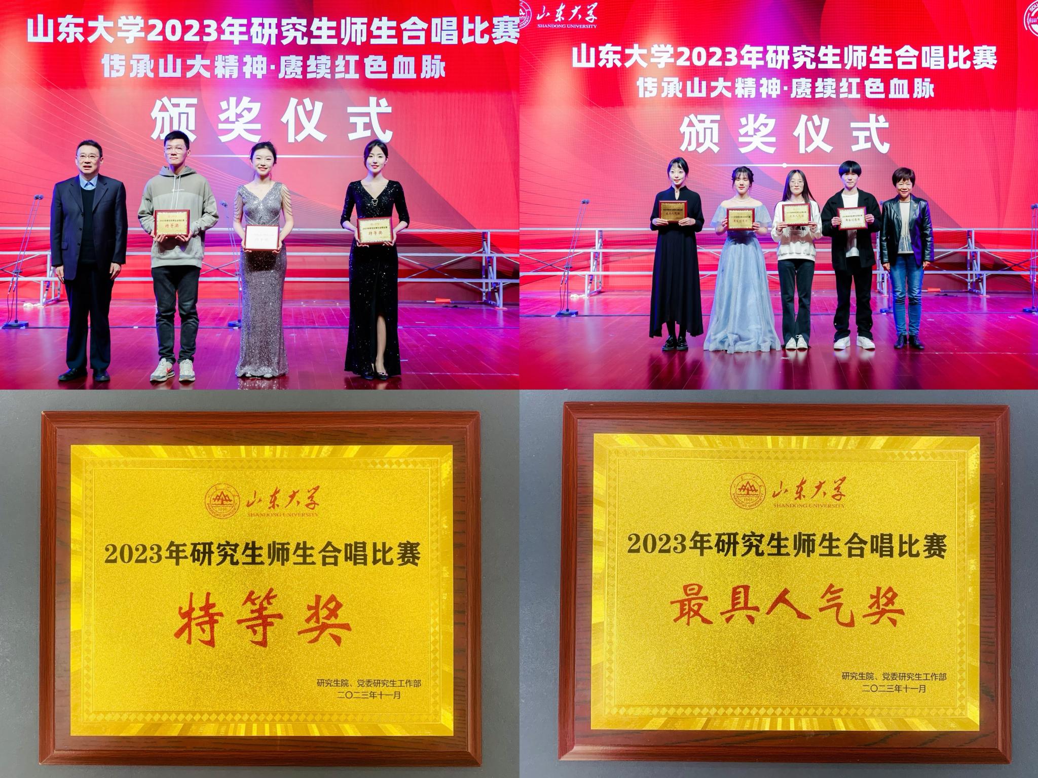 11月9日,由山东大学研究生院、党委研究生工作部、艺术学院主办的“传承山大精神·赓续红色血脉”山东大学2023年研究生师生合唱比赛在中心校区音乐厅举行。经过激烈角逐,软件学院师生参赛队伍以98.79的高分位列第一,从全校28支队伍中夺冠,荣获特等奖、最具人气奖。