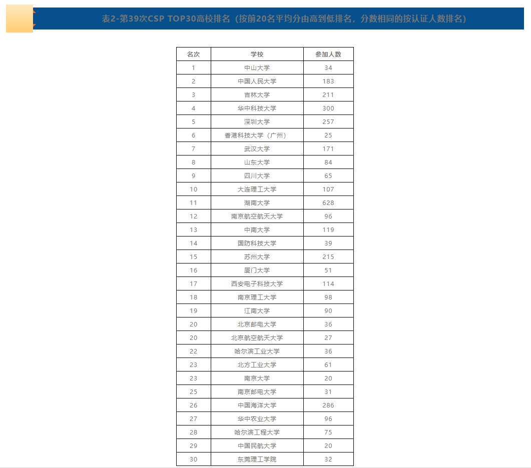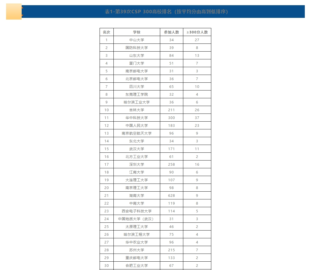 山东大学在CCF CSP(中国计算机学会软件能力认证)第39次认证中,荣获CSP300排名第三的优秀成绩,同时荣获CSP TOP30高校排名第八。