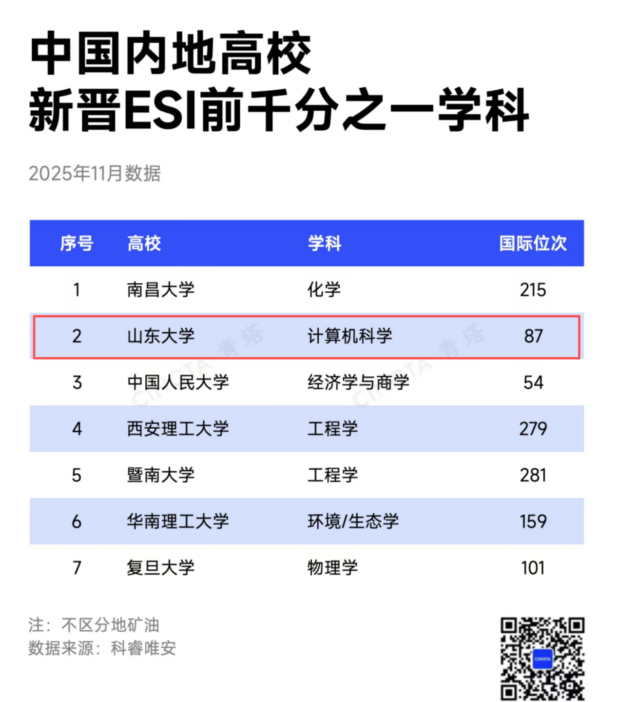 11月13日,科睿唯安发布了最新ESI(Essential Science Indicators,基本科学指标数据库)统计数据,山东大学计算机科学(COMPUTER SCIENCE)学科成功跻身ESI世界前1‰行列。