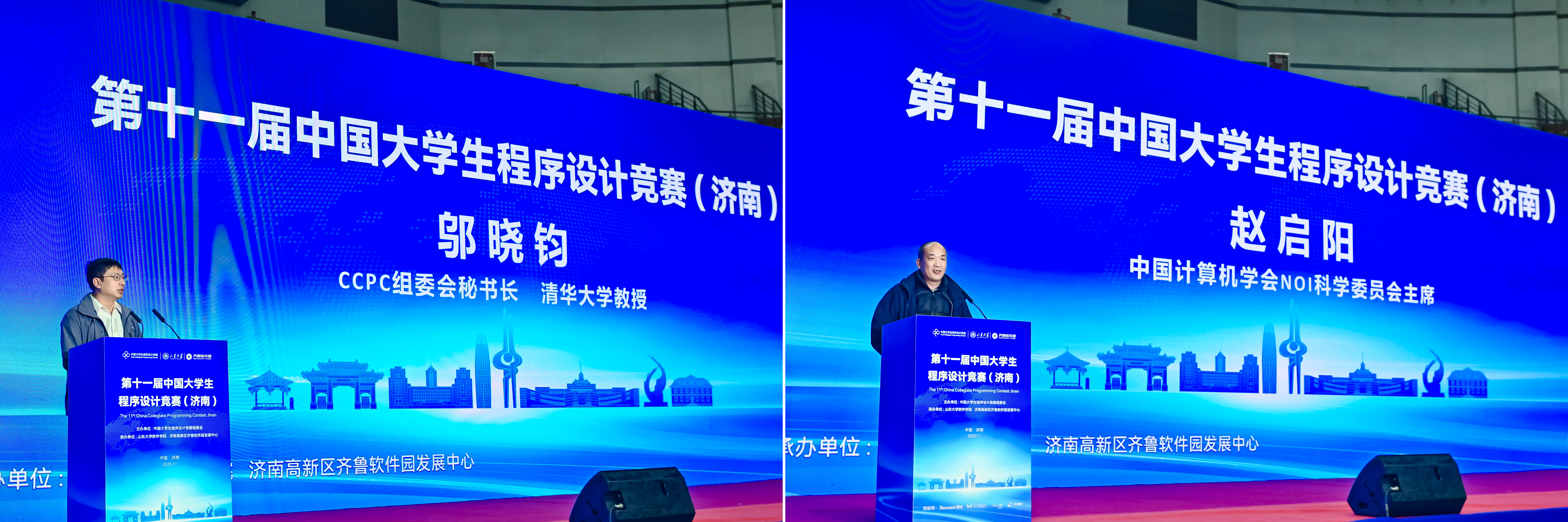 中国大学生程序设计竞赛(CCPC)组委会秘书长、清华大学邬晓钧教授,山大95级校友、中国计算机学会NOI科学委员会主席赵启阳分别致辞,希望与山东大学、与济南市加强合作,选拔出大批有创新意识和创新能力的高素质信息人才,共同推动程序设计教育的进步。湖南大学吴昊教授、中山大学陈景泰教授、北京邮电大学蔡佩霖、山东大学安相宇作为教练代表、裁判代表、选手代表、志愿者代表先后发言。