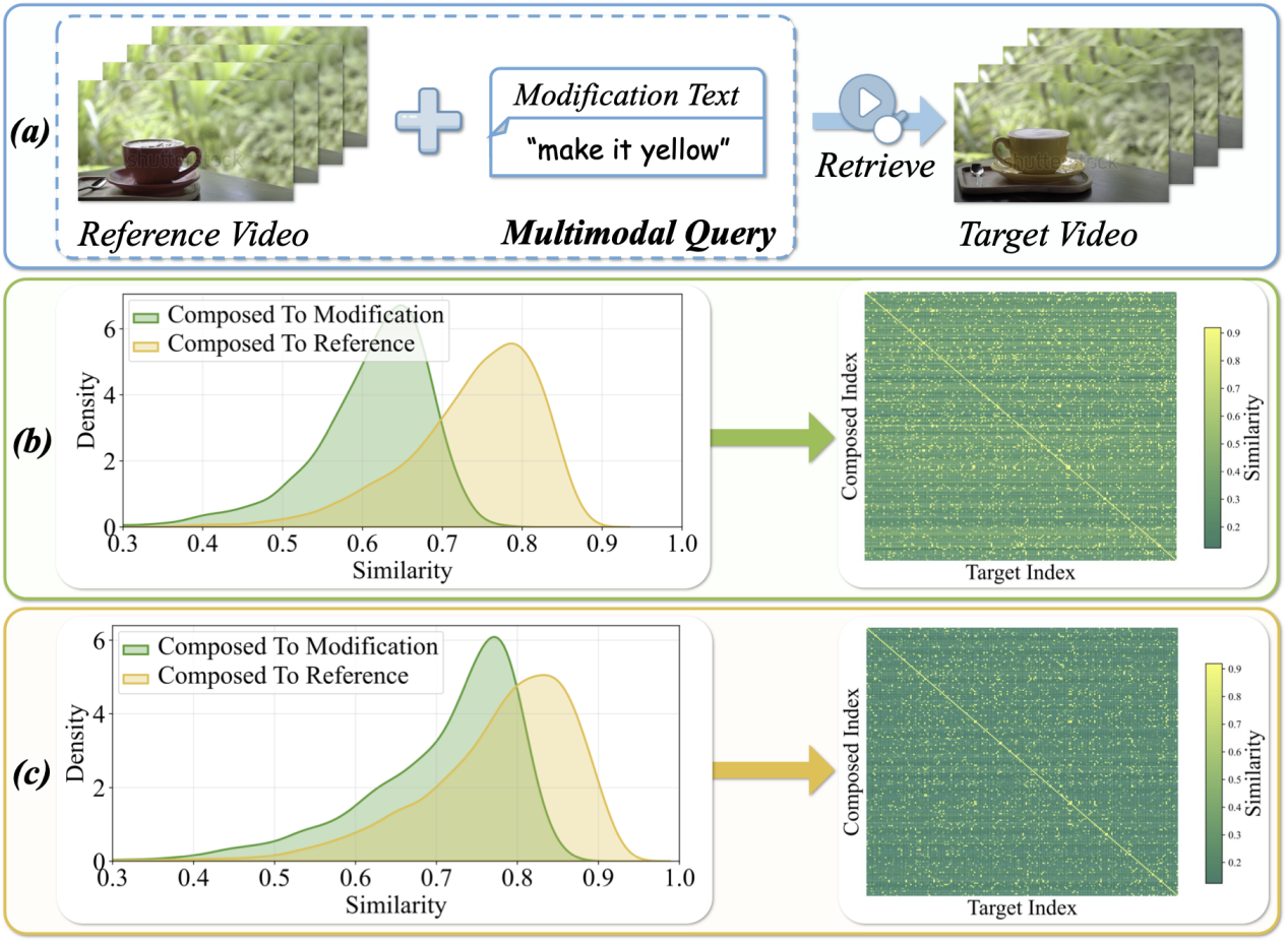随着视频数据的快速增长,组合视频检索(Composed Video Retrieval, CVR)作为一种新颖的视频检索范式,正受到越来越多研究者的关注。与单模态视频检索方法不同,CVR 任务的输入是一个多模态查询(包括参考视频和一段修改文本),其中修改文本用于表达用户希望在参考视频基础上进行的修改需求。随后,模型根据这一输入检索最相关的目标视频。在 CVR 任务中,视频与文本在信息密度上存在显著差异,传统的组合方式容易使组合特征过度偏向参考视频,从而导致次优的检索结果。由于以下三个挑战,这一局限性并非微不足道:1)模态贡献耦合;2)组合特征的显式优化;3)检索不确定性。为了解决上述挑战,我们提出了基于证据驱动的双流方向锚点校准网络(ReTrack)。ReTrack 是第一个通过纠正组合特征方向偏差来提升多模态查询理解能力的 CVR 框架,它包括三个关键模块:(a) 模态语义贡献解耦;(b) 组合几何校准;(c) 可靠的证据驱动对齐。通过估计各模态的语义贡献来校准组合特征中的方向偏差,并基于校准后的方向锚点计算双向证据,从而驱动更可靠的组合查询与目标视频相似度计算。此外,我们提出的 ReTrack 还能够同时适用于组合图像检索(CIR)任务,并在四个 CVR 与 CIR 基准数据集上均取得了当前最先进的性能。