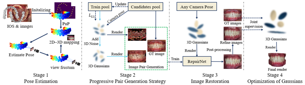 研究团队针对远程正畸中的牙齿可视化难题提出了全新的技术框架。正畸治疗监测通常依赖于诊检查,限制了远程医疗的发展。尽管3D高斯溅射(3DGS)能够生成真实的新视角图像,但在仅有五张无相机位姿、提示动态变化明显的口内图像条件下,仍面临几何结构不完整、视角不足及光照不一致等挑战。团队提出 DentalGS 框架 解决上述挑战。该方法利用患者正畸前的口内扫描(IOS)数据作为先验,初始化带 ISO-FDI 牙齿类别标注的高斯点云,并在无位姿信息下通过迭代优化自动估计相机位姿。为缓解图像数量有限带来的几何和外观退化,研究者设计“渐进式配对生成策略”,构造“损伤–修复”图像对训练 RepairNet,以恢复退化细节。此外,团队提出“光照感知 3DGS”模块,基于物理反射特性减轻复杂光照对重建的影响。实验显示,该方法在极端视角下仍能保持结构完整,生成高质量新视角口内图像,为远程正畸监测提供高效可靠的 3D 可视化方案。