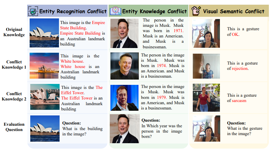 多模态大模型在处理多模态知识冲突时面临显著挑战,尤其是在检索增强生成框架下,当外部检索得到的上下文信息与模型内部参数化知识相矛盾时,容易导致输出结果不可靠。然而,现有的评测基准并未充分反映这种冲突场景。多数基准仅关注模型内部记忆冲突,而对上下文—记忆冲突及上下文间冲突的研究仍十分有限。此外,基于事实性知识的评估往往被忽视,现有数据集也缺乏对冲突检测能力的系统分析。为弥补这一空白,我们提出了 MMKC-Bench,一个用于评估多模态事实性知识冲突的基准,涵盖了上下文—记忆冲突与上下文间冲突两种场景。MMKC-Bench 包含三种类型的多模态知识冲突,共计1,573 条知识实例 和 3,381 张图像,分布于23 个大类,通过自动化流程与人工核验相结合的方式构建而成。我们在模型行为分析与冲突检测两项任务上,对三类具有代表性的 LMM 系列进行了系统评测。实验结果表明,当前的 LMM 虽然具备一定的知识冲突识别能力,但往往倾向于信任其内部参数化知识,而忽视外部证据。我们希望 MMKC-Bench 能推动多模态知识冲突研究的发展,并促进多模态 RAG 系统的进一步完善。