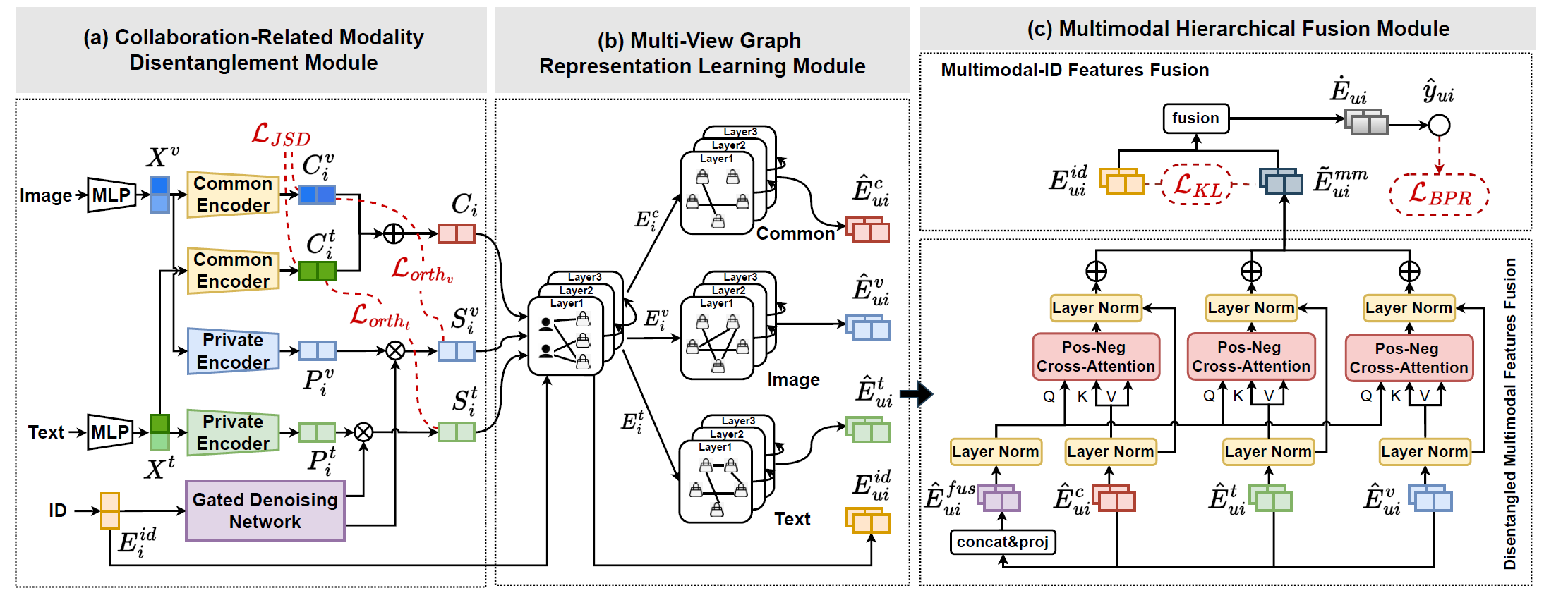 多模态推荐系统已成为利用多种数据模态提供个性化服务的关键范式。当前的研究主要集中在通过图学习整合异构模态信息。然而,这些方法面临两个关键挑战:(1)模态固有的复杂性,表现为纠缠的冗余信号和噪声;(2)有效整合多模态表示的挑战,不同模态表示可能对用户的偏好产生不同程度的影响。为了解决这些挑战,我们提出了一种新颖的协作引导多模态解耦与分层融合推荐方法(DHMRec),该方法同时实现了模态内的去噪解耦和模态间的分层融合。具体而言,我们引入了一个与协作相关的模态解耦模块,以区分模态共有的特征和模态特有的特征。然后,通过多视图图学习来捕获项目间依赖关系和用户-项目交互模式。此外,我们还在解耦的多模态特征和ID嵌入之间实现了分层融合,分别采用基于正负注意力感知的融合模块和基于交互分布的对齐模块。在三个基准数据集上进行的大量实验表明,我们提出的DHMRec优于基线模型,突显了其在模态内解耦和多模态特征融合方面的有效性。
