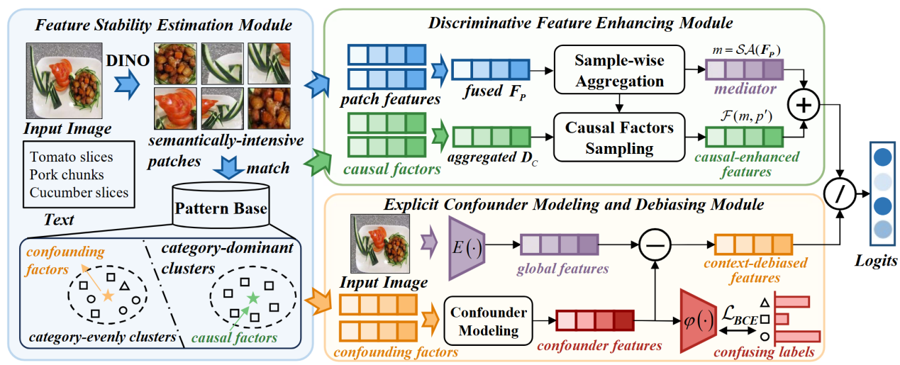 研究团队针对复杂场景下的图像分类易受语义混淆与虚假相关影响的问题,提出了新的因果表征学习框架 Explicit Modeling Causal Model(EMCM)。传统方法多依赖潜在混淆因素的隐式建模,偏向将偏差归结为背景信息,往往忽略目标级语义混淆,造成因果与混淆因素难以有效区分。EMCM 通过显式刻画因果因素与混淆因素,改善这一限制。首先,特征稳定性评估(FSE)模块利用语义聚类结构与标签信息,显式区分类别相关的因果因素和来自语义模糊类别的混淆因素。其次,因果特征增强(DFE)模块基于前门干预,将因果因素融入 patch 特征中,改善稳定语义表征。显式混淆建模与去偏(ECMD)模块在标签指导下直接学习混淆因素,并通过 TDE 建模生成去偏上下文特征。实验结果显示,EMCM 能在复杂场景下分离因果与混淆因素,并在多个数据集上获得优于现有因果去偏和文本引导方法的表现,为提升视觉表征的泛化能力提供了可行方案。