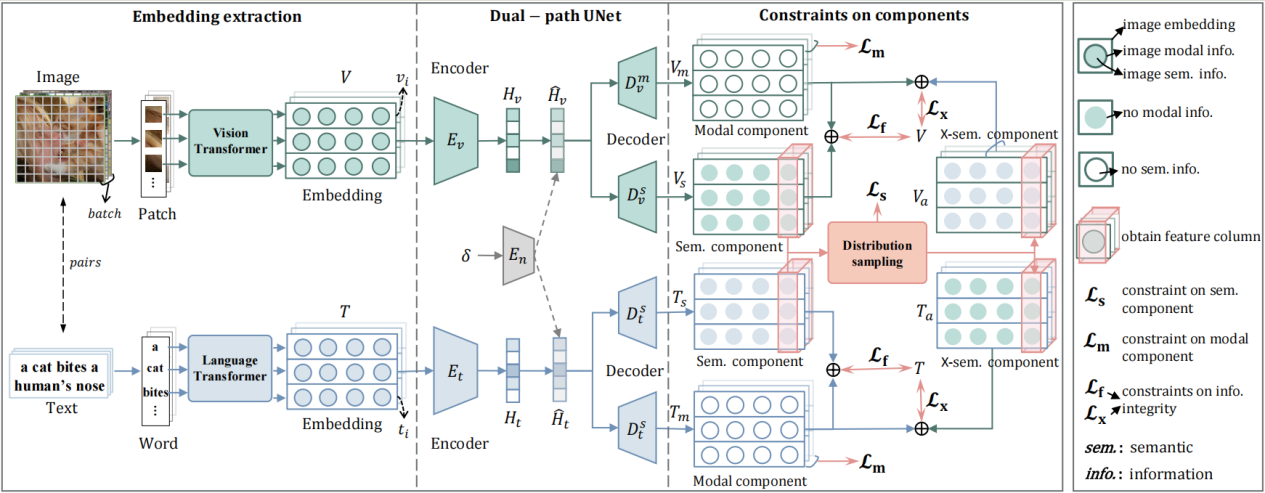 本研究主要针对跨模态对齐中的可靠性问题。跨模态对齐是多模态学习中的关键任务,旨在实现视觉与语言等不同模态之间的语义一致性,这要求图像-文本对展现出相似的语义特征。现有算法通过保证不同模态嵌入的一致性来实现语义对齐,却忽略了嵌入中存在的非语义信息,导致语义对齐偏差或信息损失。一种直观的解决思路是将嵌入解耦为语义成分与模态成分,仅对语义成分进行对齐。但语义信息与模态信息缺乏明确的区分标准,很难显示定义。为此,本研究提出一种通过带约束的解耦与分布采样(CDDS)的跨模态对齐新算法,核心包括:引入双路径UNet自适应解耦嵌入表示,通过多重约束确保有效分离;提出分布采样方法弥合模态差异,保障对齐过程的合理性。