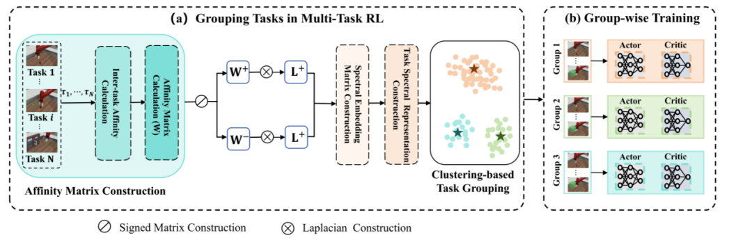 该研究针对多任务强化学习(Multi-Task Reinforcement Learning, MTRL)中任务间干扰与负迁移问题,提出了全新的MTRL-CG 框架。现有多任务强化学习方法通常采用完全共享的策略网络,在面对任务间差异或冲突时,容易出现梯度相互抵消、性能下降等现象,限制了其在复杂环境中的应用。该研究提出的MTRL-CG方法从任务间的相互影响出发,首次在多任务强化学习中引入任务分组机制。团队首先通过评估一个任务在共享函数上的梯度更新对其他任务Q值的影响程度来衡量任务间亲和力(Affinity),从而构建任务间亲和度矩阵。在此矩阵基础上,为得到有效分组,研究者采用符号谱聚类,构建任务谱表示并应用k-means聚类形成最终的分组。最后,团队根据分组结果分别在每个任务组内独立训练强化学习模型。每个任务组分配一个专用的SAC模型,以实现集中的策略学习,促进组内知识共享,同时减少不相关任务的干扰。实验显示,该方法能够在多种仿真环境中显著提升准确率和稳定性,为多任务强化学习的高效学习与泛化提供了新的解决方案。