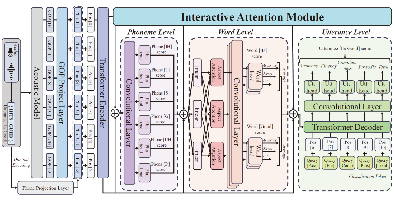 研究团队针对计算机辅助发音训练(CAPT)中的多维度评估难题提出了全新的技术框架。自动发音评估(APA)通常依赖于单层级建模,限制了复杂发音错误的诊断能力。尽管多粒度方法能并行处理音素、词汇与语句级任务,但在仅考虑相邻层级单向依赖、缺乏跨尺度双向交互的条件下,仍面临声学结构关联性缺失、特征遗忘及局部上下文提取不足等挑战。团队提出HIA框架解决上述挑战。该方法利用残差层次结构,初始化基于交互式注意力的跨粒度双向通路,并在无额外标注下通过注意力机制动态估计层级间依赖。为缓解单向交互带来的信息瓶颈,研究者设计“交互式注意力模块”,构造“音素–词汇–语句”三元组实现双向建模,以恢复丢失的声学关联。此外,团队使用“一维卷积增强”模块,基于局部感受野特性减轻特征遗忘对分层建模的影响。在speechocean762数据集上的实验显示,该方法取得显著超越现有最先进方法的综合性能,为非母语者英文发音训练提供高效可靠的多维度评估方案。