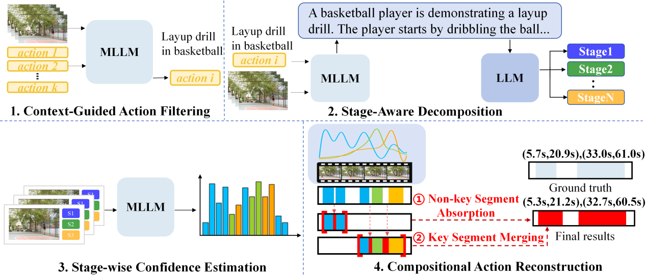 零样本时序动作定位 (Zero-Shot Temporal Action Localization, ZSTAL) 作为开放世界视频理解领域的一项核心挑战任务,旨在定位视频中未曾出现在训练集中的动作实例。然而,当前的 ZSTAL 方法,无论是基于训练还是免训练的,通常都依赖于单一的、统一的查询来定位整个动作。这种统一的表示在面对以内部组合结构、动态性和多阶段变化为主导的复杂现实世界活动时,存在根本性缺陷,无法捕获活动的内部组合结构,也难以适应视频中动态的、多阶段的变化。为此,本研究提出了一种新颖的组合推理框架CASCADE(Context-Aware Staged Action DEcomposition)。该框架的灵感来源于人类认知过程中的“感知上下文、分解事件和重建实例”步骤,并遵循一个免训练的流程,实现轻量化且鲁棒的定位。该框架利用多模态大语言模型 (MLLM) 感知视频的上下文,通过过滤不相关动作并为每个现有动作生成丰富的、视频特定的描述,从而紧凑地捕捉稳定的上下文规律。为弥补统一查询过程中未保留的阶段性变化,CASCADE 采用一种分解-重建架构:首先将动作分解为具有清晰语义的阶段性子动作,并为每个子动作生成多个细粒度的查询;随后,通过一个新颖的内容感知的相似度聚合机制,CASCADE 将这些子动作的定位结果重建为一个完整的动作实例。两个公开数据集上的实验结果表明,CASCADE 显著优于现有的 ZSTAL 方法,有力地证明了将 ZSTAL 视作组合推理任务的有效性。