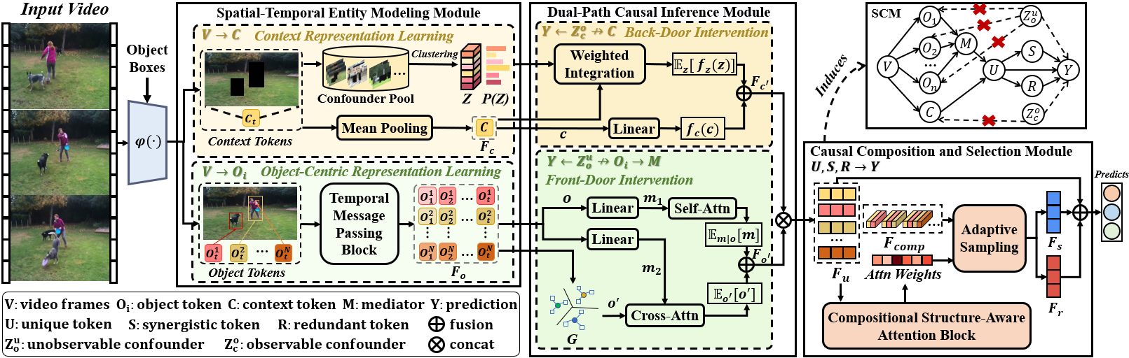 视频分类需要对对象及其交互进行事件级表示,而现有方法通常依赖数据驱动的方式,从整帧或对象中心的视觉区域中学习特征,因此往往忽略了对象间的时空交互。为此,本文提出了一种协同、独特与冗余因果表示分解学习(SurdCRL)模型,该模型引入 SURD 因果理论,用于建模对象动态及其帧内与跨帧交互的时空特征。具体而言,SurdCRL 通过三个模块对对象中心的时空动态进行建模:时空实体建模模块将帧解耦为对象与上下文实体,并利用时序消息传递捕捉对象状态随时间的变化,生成基本因果变量;双路径因果推理模块通过前门和后门干预缓解因果变量间的混淆因素,使后续因果成分能够反映其内在效应;因果组合与选择模块利用结构感知组合注意力,将因果变量及其高阶交互映射为协同、独特和冗余三类因果成分。在两个基准数据集上的实验结果表明,SurdCRL 通过分解时空对象交互,更有效地捕捉了与事件相关的对象中心表示。