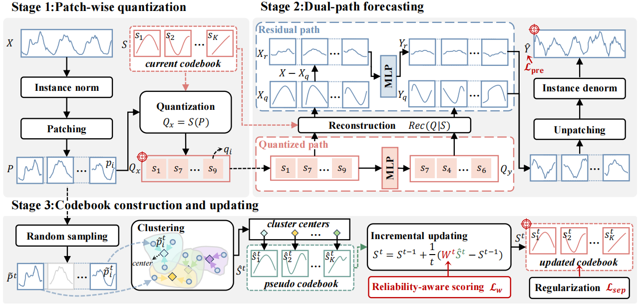时间序列预测在众多领域应用中具有关键作用。现有方法通常依赖于将序列全局分解为趋势项、季节项和残差项,但面对以局部性、复杂性和高度动态性为主导的真实世界的序列时,效果并不理想。并且此类方法的高模型复杂度也限制了其在实时或资源受限环境中的应用。为此,本研究提出了一种新颖的基于可靠性感知码本的时序预测框架(ReCast),通过挖掘在历史数据中重复出现的局部形态,实现轻量化且鲁棒的预测。ReCast利用可学习码本通过分片量化(quantization)将局部模式编码为离散嵌入,从而紧凑地捕捉稳定的规律性结构。为弥补量化过程中未保留的残差变化,ReCast采用一种双路径架构:量化路径用于高效建模规律结构,残差路径则负责重构不规则残差。该框架的核心创新在于可靠性感知的码本更新策略,通过加权修正实现码本逐步优化。修正权重取自分布鲁棒优化(DRO)对多视角可靠性因子的融合,确保模型能适应非平稳性并抑制分布漂移的影响。