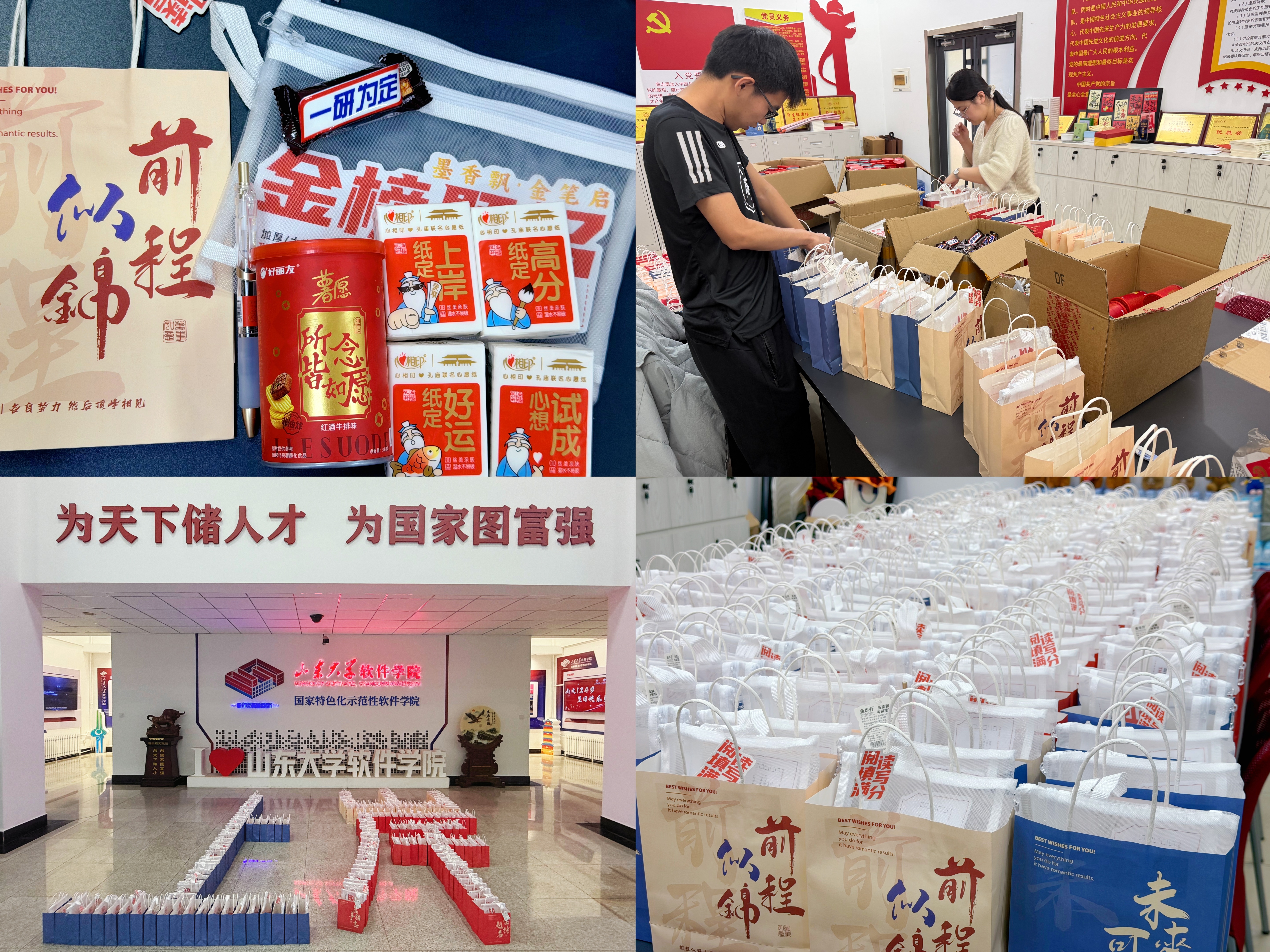 暖心礼包“配齐”,筑牢备考后勤保障。为解决考研学子备考实际需求,软件学院提前调研、精心筹备,为每位考生准备助考暖心礼包。礼包内含考试手提文具袋、专用笔、手帕纸等实用物品,还搭配定制薯片、士力架等零食,为学子赴考提供便利、补充能量。