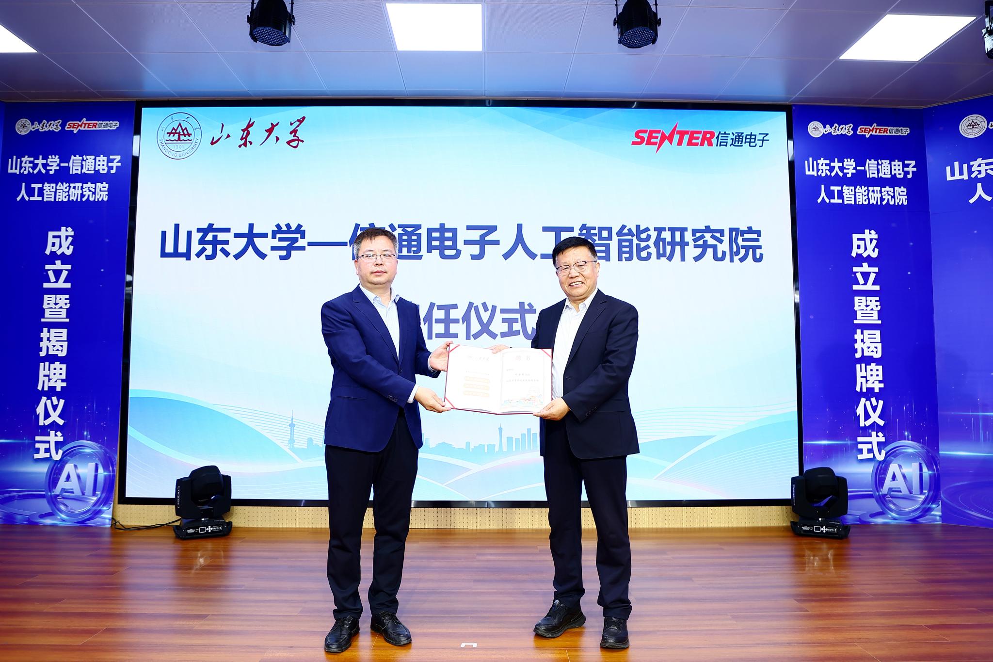仪式聘任软件学院教授、山东省人工智能学会理事长尹义龙为山东大学—信通电子人工智能研究院院长,韩忠义为常务副院长,山东信通电子股份有限公司副总裁蔡富东、山东信通电子股份有限公司济南子公司总经理吕昌峰为副院长;聘任韩忠义为山东信通电子股份有限公司研究院院长。