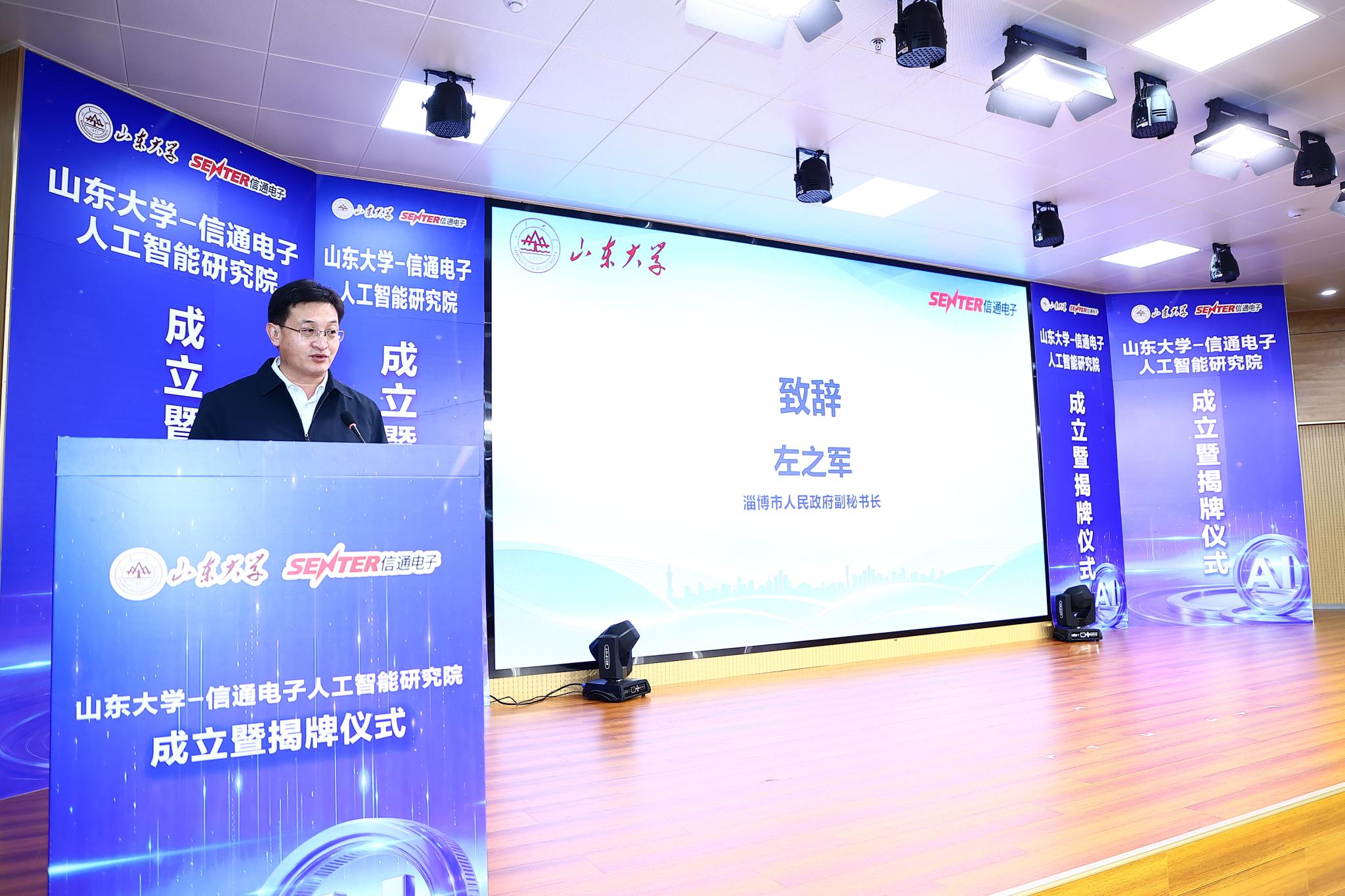 刘兆军在致辞中表示,山东大学—信通电子人工智能研究院揭牌标志着校企双方聚焦人工智能领域,深化产学研协同创新迈入了崭新阶段。山东大学将按照共建协议和研究院整体规划,以高度的责任感和使命感,全力支持研究院建设发展,推动研究院加快成为产教融合、人才培养、科技创新的一流阵地。