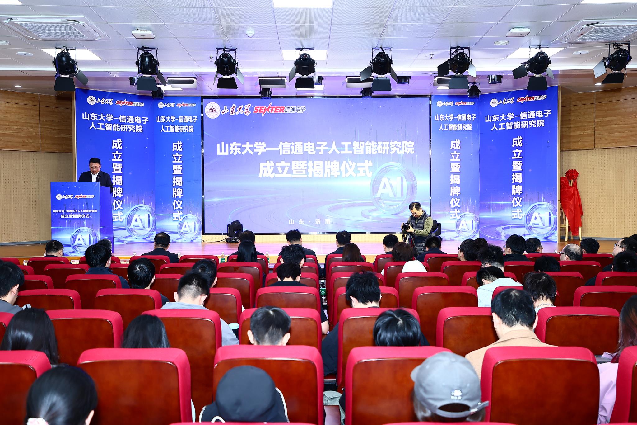 4月2日上午,山东大学—信通电子人工智能研究院成立暨揭牌仪式在软件学院举行。山东大学校长助理刘兆军,淄博市人民政府副秘书长左之军,淄博高新区工委委员、管委会副主任郭忠全,山东信通电子股份有限公司董事长李全用、总经理李莉,山东大学团委书记范金林、校友工作办公室主任王震,软件学院党委书记姜炳刚、院长崔立真参加活动。