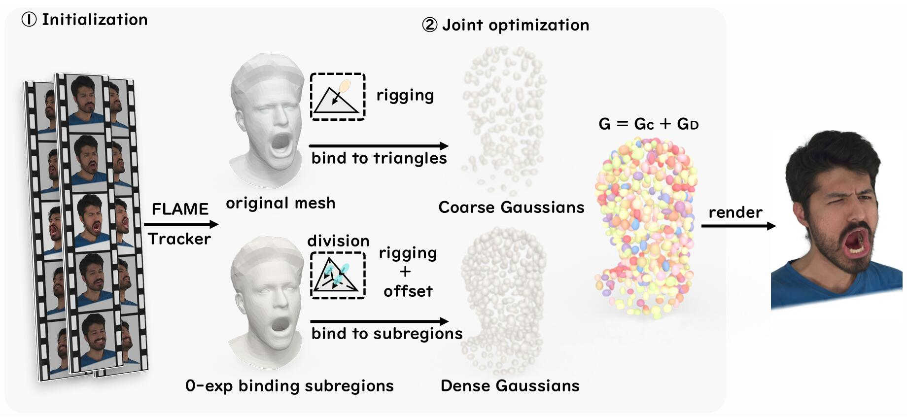 针对现有3D高斯溅射技术在重建精细面部细节,尤其是随表情变化的动态细节方面的挑战,该工作将3D高斯解耦为粗高斯与密高斯两组:粗高斯绑定于粗粒度人头网格以保证新表情下的结构稳定,密高斯绑定于密集网格以捕捉静态细节,并进一步引入基于表情Blendshape的可学习位置偏移策略,使密高斯能够动态适应面部运动,从而精确重建复杂动态特征。两组高斯在正则化约束下联合优化。实验表明,该方法在面部细节捕捉精度和实时渲染性能上均显著优于现有主流方法。