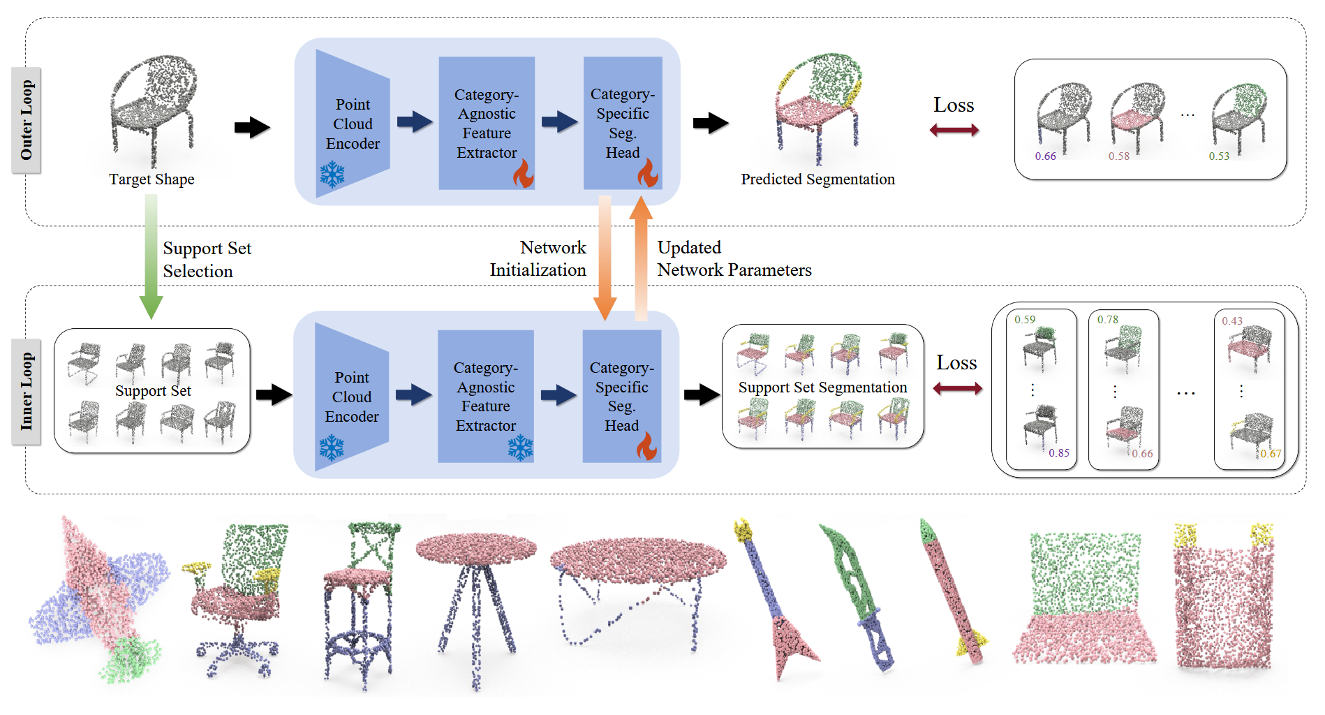 论文简介:针对现有视觉语言模型多视角预测不一致及泛化能力受限的痛点,该工作提出一种新颖的双层优化算法,将先验知识解耦为“类别无关特征提取器”和“类别特定分割头”:外层循环遍历所有训练样本以优化全局通用的特征提取器,内层循环则通过检索支撑集使分割头仅需少数几次迭代即可快速适应特定的目标类别。结合“Part-Perfect”检索策略,为目标形状的快速适应过程提供更相关且结构完善的视觉参考信息。该方法有效解决了预测冲突,在未知类别的泛化测试中展现出卓越的鲁棒性。